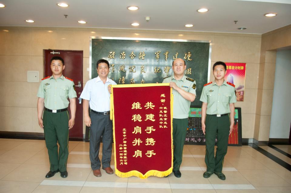 日前,總經(jīng)理黃建偉將一面書寫著“共建手攜手、維穩(wěn)肩并肩”的錦旗,送到了武警北京總隊駐廣電總局某部, 表達了北京中廣物業(yè)管理有限公司對武警官兵的感謝之情。