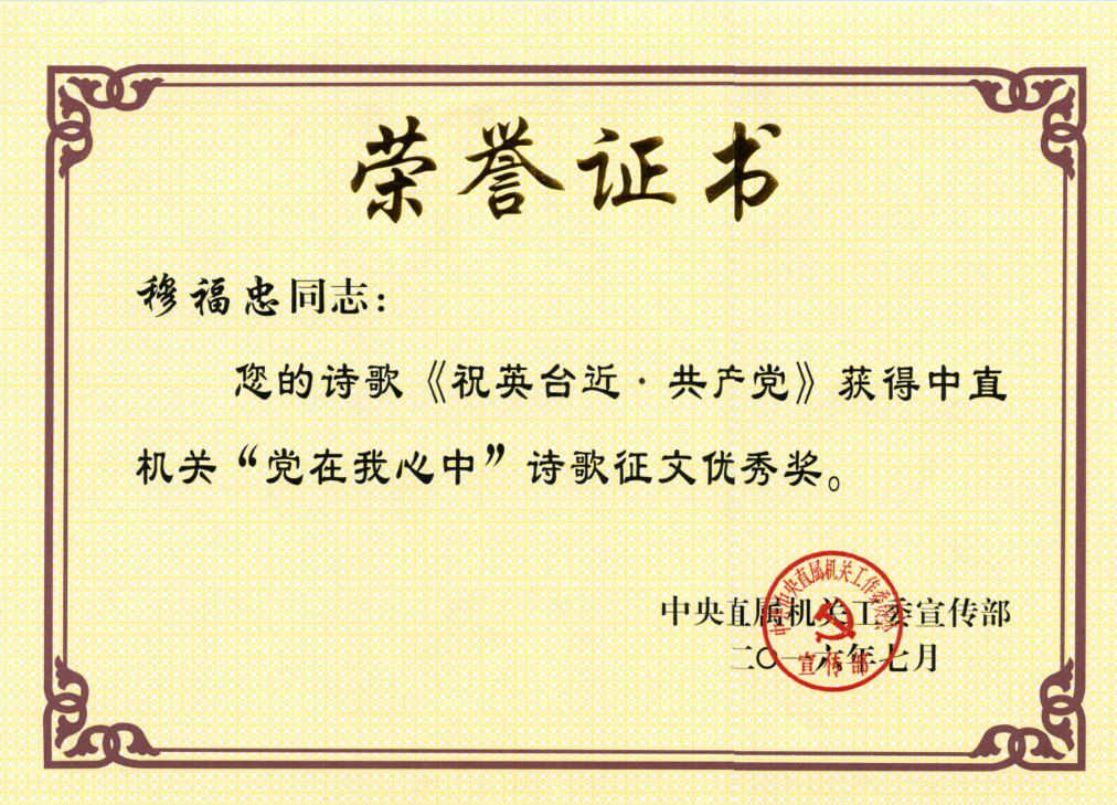 在慶祝中國(guó)共產(chǎn)黨成立95周年、紀(jì)念中國(guó)工農(nóng)紅軍長(zhǎng)征勝利80周年之際,中直工委舉辦了中直機(jī)關(guān)“黨在我心中”詩(shī)歌征文活動(dòng),公司黨總支按照要求動(dòng)員部署,公司黨員、入黨積極分子、寫申請(qǐng)書人員和廣大員工積極踴躍投稿。穆福忠同志的詩(shī)歌《祝英臺(tái)近?共產(chǎn)黨》獲得中直機(jī)關(guān)“黨在我心中”詩(shī)歌征文優(yōu)秀獎(jiǎng)。