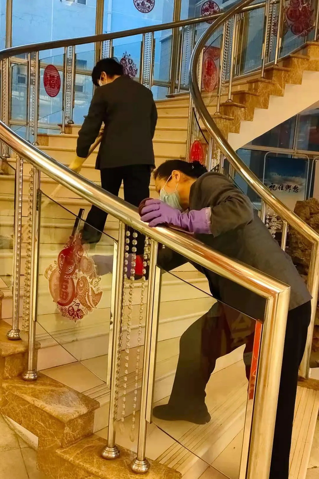 “看似尋常最奇崛,成如容易卻艱辛?!惫绢I導高度重視,多次前往現(xiàn)場督導,了解到方樓一層大廳面積較大,地面殘留污漬清洗困難,每天需要5名保潔人員同時作業(yè)近一個小時的情況后,當即決定采購專業(yè)洗地設備,提高工作效率,提升對臺服務品質(zhì)。并強調(diào)方樓公共區(qū)域環(huán)境整潔事關總臺形象,要高標準、嚴要求,確保不留衛(wèi)生死角,切實提高服務質(zhì)量和服務水平。復興路項目部不等不靠,發(fā)揚艱苦奮斗“老黃牛”精神,始終扛牢責任擔當,提前制定工作計劃,從細節(jié)入手,克服人員緊缺,在無相關清潔設備的情況下,保潔領班帶領員工主動放棄休息,不計得失,用墩布和塵推,從方樓頂層至B2,逐層逐級清潔樓道地面、樓梯扶手、踢腳線等公共區(qū)域,反復打磨每一處細節(jié),直到?jīng)]有一點污漬。經(jīng)過半個多月的努力,方樓公共區(qū)域整潔有序,環(huán)境品質(zhì)煥然一新,獲得總臺物業(yè)處相關領導對公司物業(yè)服務的高度認可。