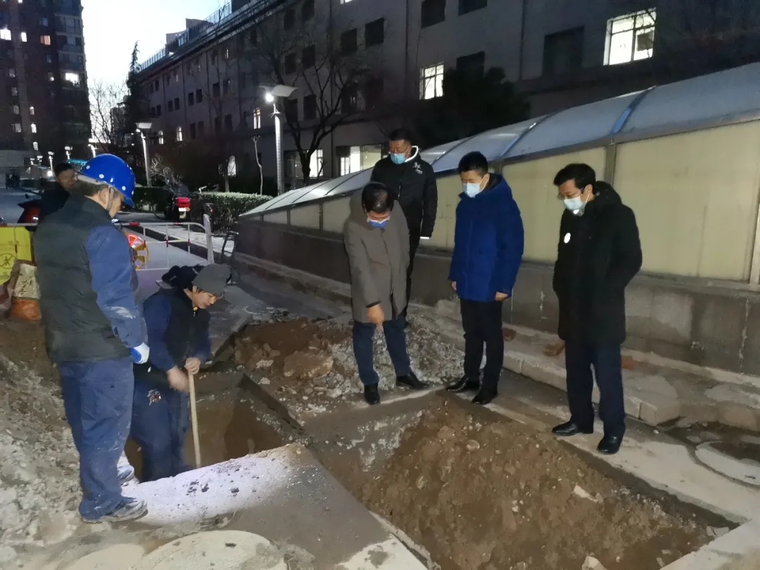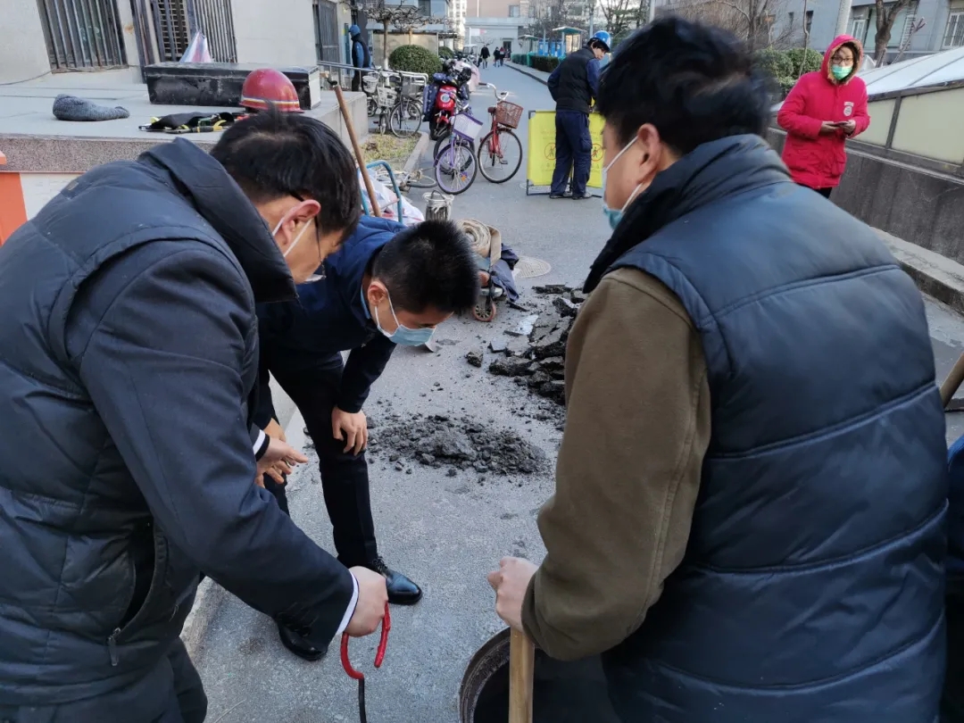 次日早8:00,項(xiàng)目部組織維修人員按照預(yù)定方案,布置好安全防護(hù)、警戒等措施后開始作業(yè),大家頂著凜冽的寒風(fēng)輪番開鑿地面、挖土方,于下午16:30找到了漏水點(diǎn)。但由于漏水點(diǎn)在暖氣管井底混凝土下,給搶修工作增添了難度,為了不破壞暖氣管井,減少停暖對(duì)住戶的影響,項(xiàng)目部及時(shí)調(diào)整搶修方案,決定采取管井外斷管,再敷設(shè)新管鑿?fù)ň谂c井內(nèi)管道連接的方案,并決定第三天再予以搶修。