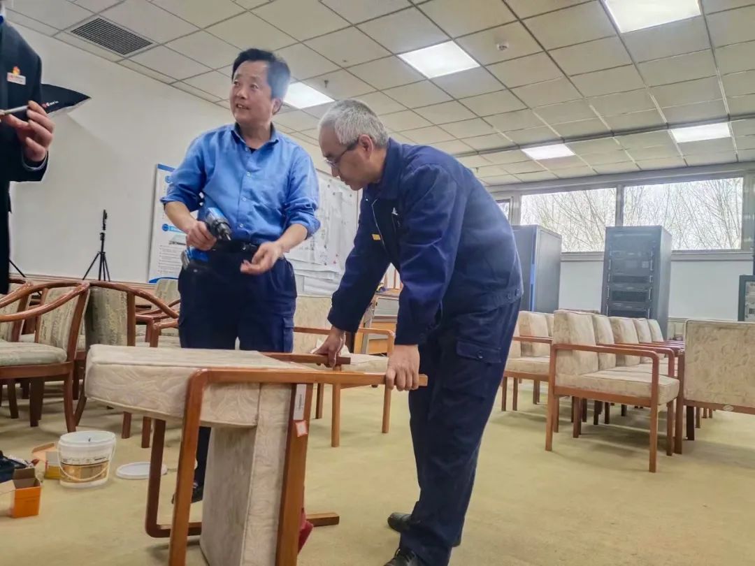 總局研修學(xué)院項(xiàng)目部會(huì)議室座椅已投入使用多年,出現(xiàn)了不同程度的松動(dòng)和破損現(xiàn)象,存在一定的安全隱患。項(xiàng)目部組織人員對(duì)松動(dòng)破損座椅進(jìn)行排查與維修,同時(shí)與音像資料館項(xiàng)目部溝通,協(xié)調(diào)具有豐富經(jīng)驗(yàn)的王維彬師傅予以支持。維修過程中,王師傅一眼便看出座椅松動(dòng)的“癥結(jié)”所在,經(jīng)過4個(gè)多小時(shí)的維修,60余把椅子在王師傅的“妙手回春”下,變得穩(wěn)固而實(shí)用。同時(shí)王師傅毫無保留的向大家傳授專業(yè)技術(shù)與經(jīng)驗(yàn),并將精益求精的工作態(tài)度傳遞給項(xiàng)目部參與協(xié)助的每一個(gè)人,大家紛紛表示受益良多。煥然一新的座椅也獲得了甲方領(lǐng)導(dǎo)的充分肯定。