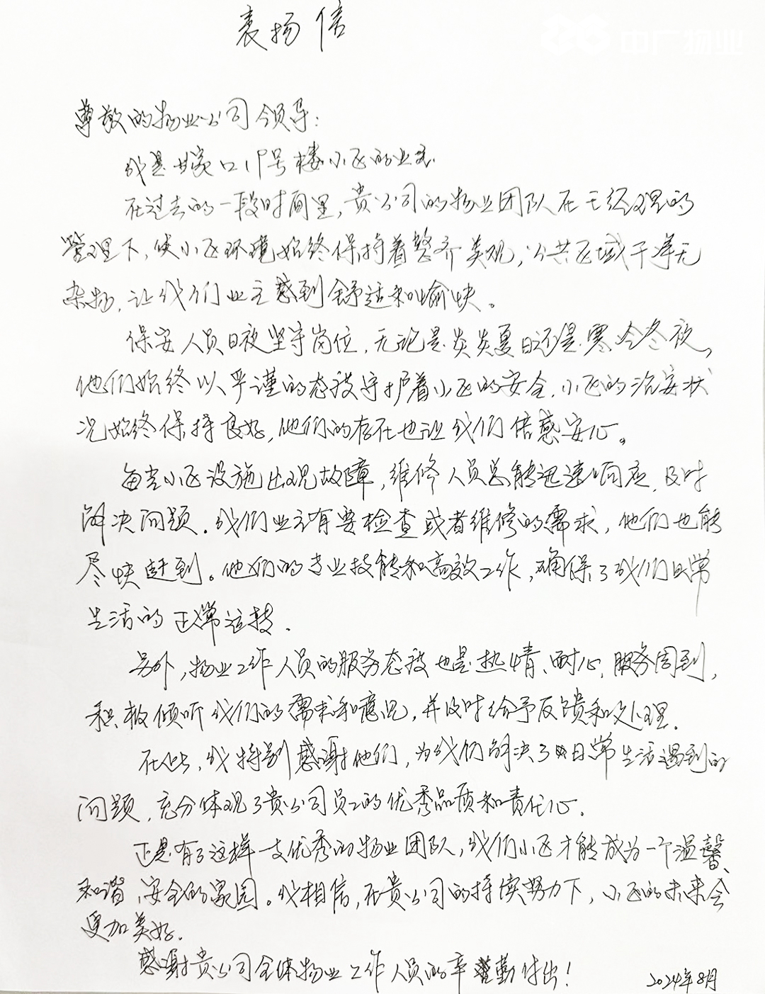 近日,北京中廣物業(yè)管理有限公司甘家口項(xiàng)目收到一封來(lái)自業(yè)主親筆手寫的表?yè)P(yáng)信,字里行間對(duì)公司物業(yè)團(tuán)隊(duì)恪盡職守的工作態(tài)度、專業(yè)嚴(yán)謹(jǐn)?shù)墓ぷ髯黠L(fēng)表示高度認(rèn)可,飽含了業(yè)主對(duì)中廣人的贊揚(yáng)和感謝之情。