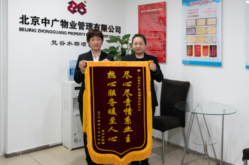 近日,家住梵谷水郡小區(qū)的業(yè)主周女士將一面印有“熱心服務(wù)暖至人心 盡心盡責(zé)情系業(yè)主”字樣的錦旗送到了北京中廣物業(yè)管理有限公司梵谷水郡項(xiàng)目部,并對(duì)項(xiàng)目部工作人員積極維護(hù)和諧鄰里關(guān)系表示感謝。