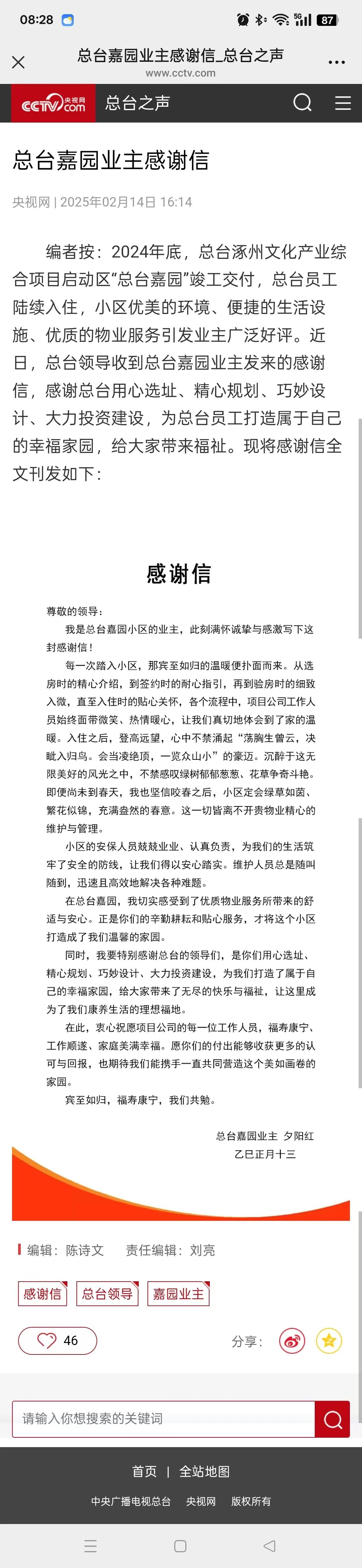 據(jù)央視網(wǎng)總臺(tái)之聲報(bào)道,近日,總臺(tái)領(lǐng)導(dǎo)收到總臺(tái)嘉園業(yè)主“夕陽紅”發(fā)來的感謝信,信中感謝總臺(tái)用心選址、精心規(guī)劃、巧妙設(shè)計(jì)、大力投資建設(shè),還對(duì)中廣物業(yè)公司優(yōu)質(zhì)服務(wù)給予表揚(yáng)。